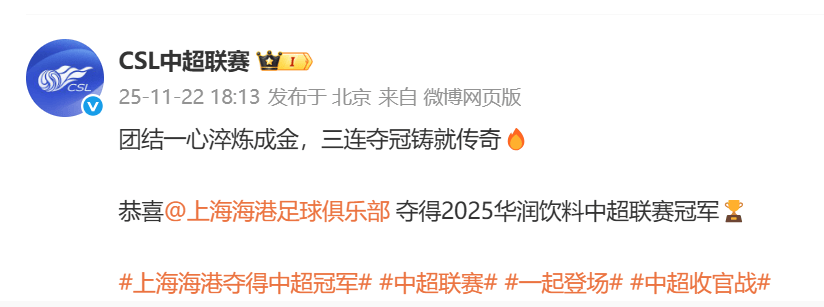 恭喜上海海港奪得2025中超聯(lián)賽冠軍??