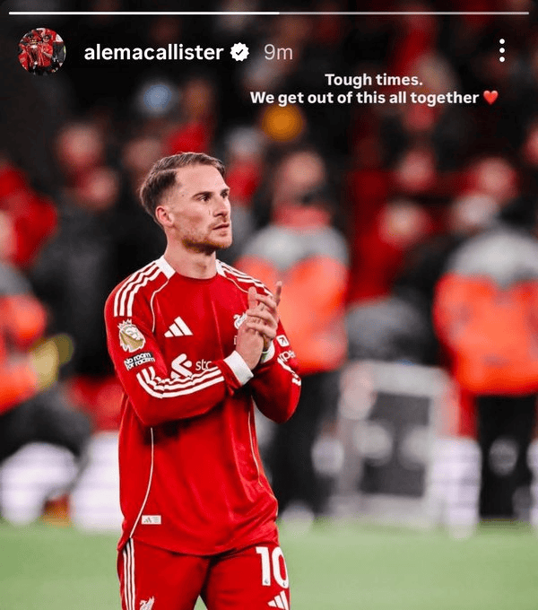 虎撲11月23日訊 在本輪英超主場慘敗給諾丁漢森林以后,利物浦已經(jīng)連續(xù)2場聯(lián)賽以0-3的板麥比分慘敗。賽后,卡利利物浦中場麥卡利斯特更新了個(gè)人社交媒體。斯特時(shí)期