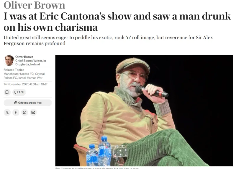 即便以他的標(biāo)準(zhǔn)來(lái)看,這場(chǎng)小型巡演也頗為奇特:德里一晚、德羅赫達(dá)一晚,橫跨愛(ài)爾蘭海在曼徹斯特與忠實(shí)粉絲共度兩晚,隨后返回里斯本,與2002年在片場(chǎng)相識(shí)的妻子拉希達(dá)?布拉尼,繼續(xù)沉浸在藝術(shù)生活中。其實(shí)即便在足球生涯巔峰時(shí)期,他的行蹤也向來(lái)難以預(yù)測(cè)。他在謝菲爾德星期三隊(duì)只待了一周:主教練特雷弗?弗朗西斯想讓他先試訓(xùn)而非直接簽約,這讓他頗為不滿。“特雷弗是位偉大的球員,” 坎通納露出狡黠的笑容,言外之意弗朗西斯絕非偉大的教練。