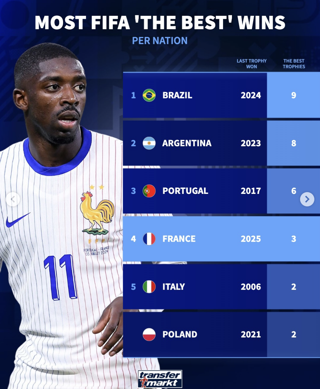 虎撲12月16日訊 德轉統(tǒng)計了獲得FIFA年度最佳球員所屬國家排行榜。
