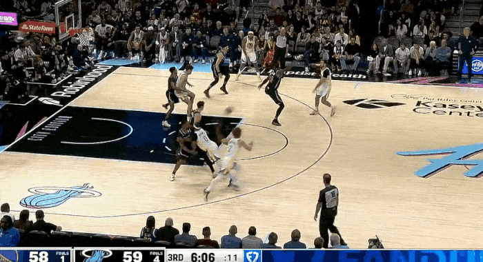第三節(jié)比賽,起打波斯特籃下轉(zhuǎn)身強(qiáng)起打進(jìn),進(jìn)勇勇士一波9-0反超熱火1分。特籃