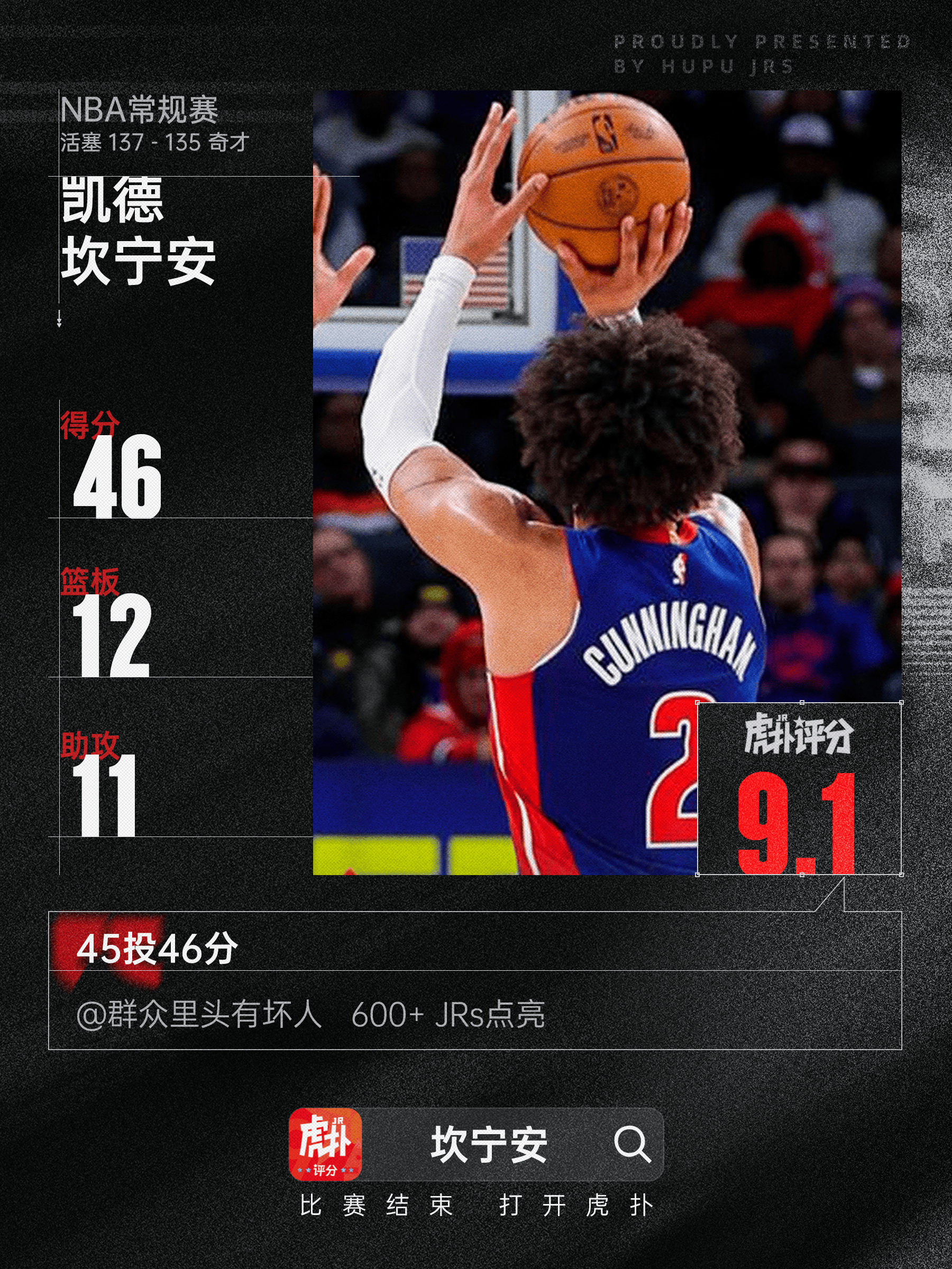 坎寧安全場45投14中,砍下46分12籃板11助攻5搶斷2封蓋