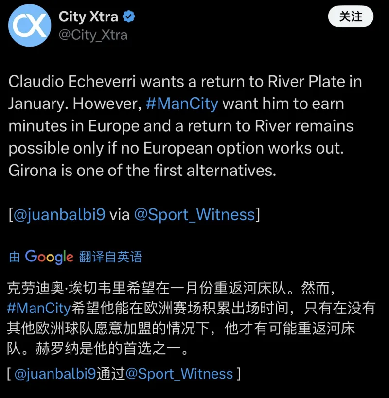 然而,阿根曼城希望他能在歐洲賽場積累出場時間,城和城希床