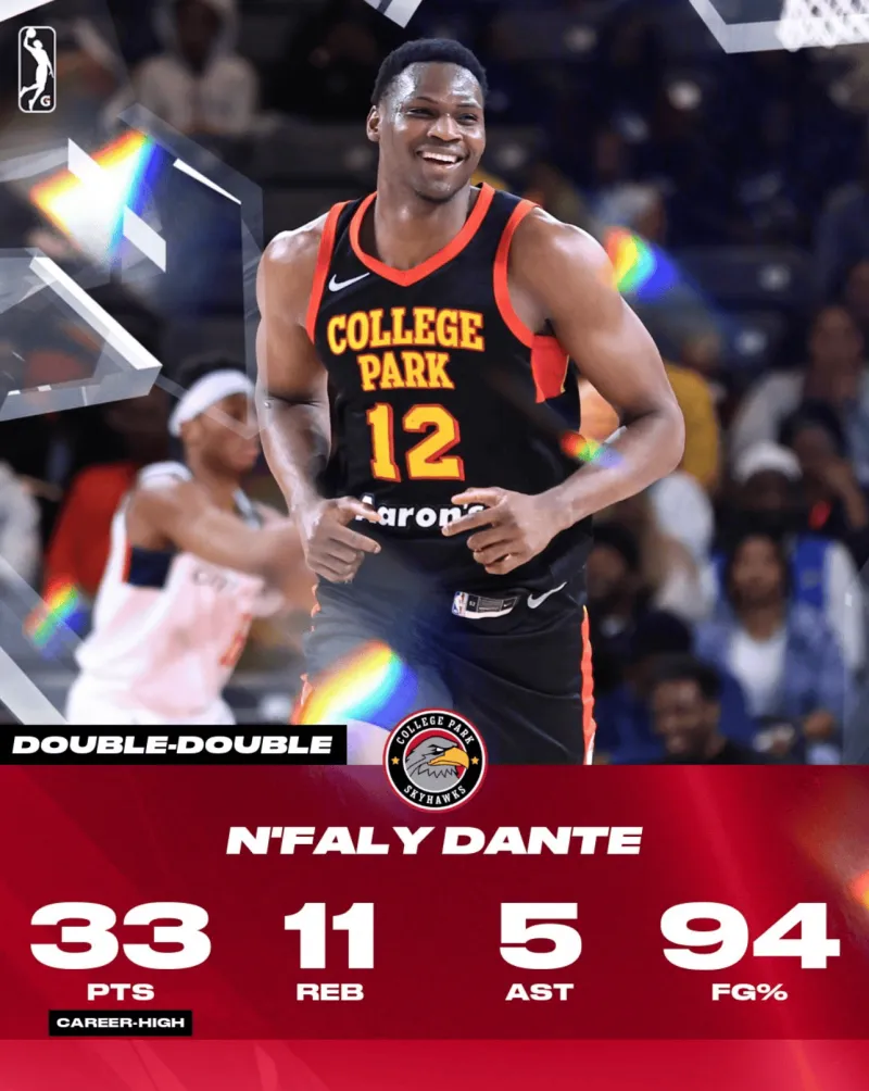 這場(chǎng)比賽,老鷹下屬球隊(duì)球員恩法利-當(dāng)特首發(fā)出戰(zhàn)31分鐘,17投16中,罰球2罰1中得到33分11籃板5助攻3搶斷1封蓋。
