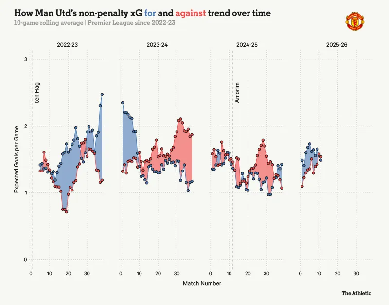 正如這份詳細(xì)記錄球隊(duì)歷代預(yù)期進(jìn)球數(shù)與預(yù)期失球數(shù)的圖表所示,曼聯(lián)的整體趨勢(shì)正在向好。要達(dá)到滕哈格首個(gè)賽季的巔峰水平仍需努力,但在長(zhǎng)期處于預(yù)期進(jìn)球差值為負(fù)(圖中紅色部分)并最終導(dǎo)致主教練更迭后,如今代表正值差值的藍(lán)色部分已愈發(fā)明顯。