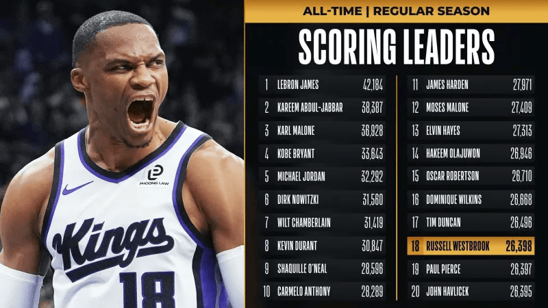 本場比賽,板準板助國王球員威斯布魯克出戰(zhàn)34分鐘,雙威少全投籃11中4、場中三分6中3得到14分9籃板7助攻2搶斷。