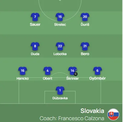 斯洛伐克首發(fā):1-杜布拉夫卡、4-奧伯特、14-什克里尼亞爾、6-貢貝爾、16-漢茨科、8-杜達、22-洛博特卡、21-貝羅、7-紹爾、20-杜里什、15-斯特雷萊茨