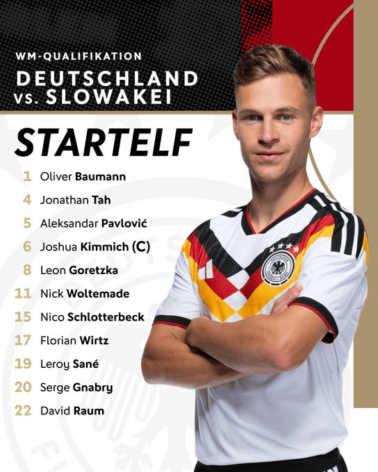 德國替補:12-努貝爾、21-達門、2-佳夫、3-安東、18-布朗、23-巴庫、7-萊韋林、9-韋德拉奧果、13-恩梅查、16-沙德、10-伯克特、14-阿德耶米