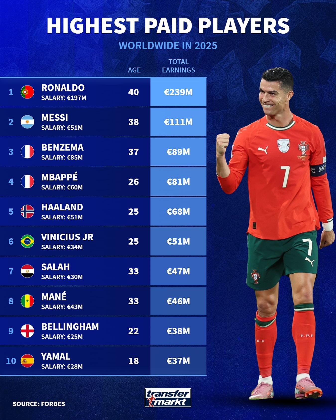 虎撲10月18日訊 《福布斯》公布了2025年全球收入最高的運動員榜單,德轉(zhuǎn)隨后對其中的板福布足球明星進(jìn)行了盤點,葡萄牙球星C羅以2.39億歐元的全球球總收入遙遙領(lǐng)先。