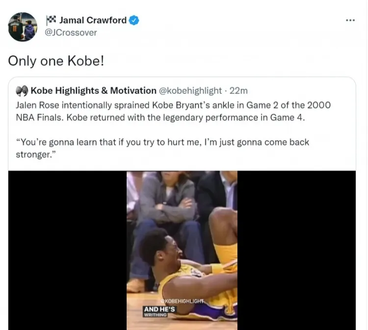 今天,自媒體賬號Kobe Highlights & Motivation分享了一段視頻,2000年的NBA總決賽G2,科比被杰倫-羅斯故意弄傷腳踝,科比僅僅出戰(zhàn)8分55秒便因傷退賽,僅僅得到2分。